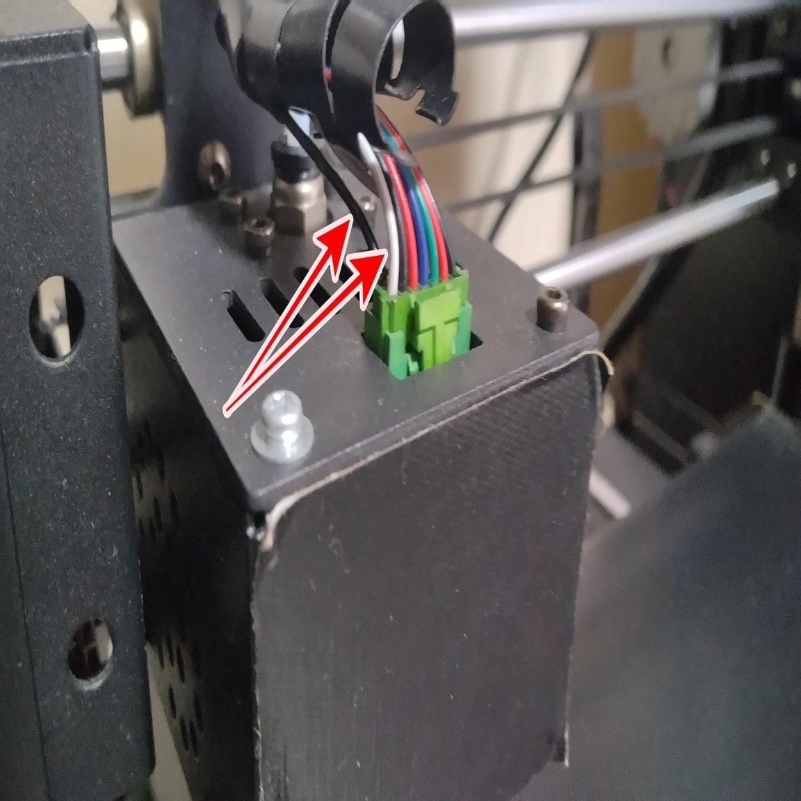 ホットエンドの上部についてる緑のコネクタの正面から見て左側の前と後ろの線(画像の左側の黒と白の線)がT0センサーと繋がっていた。